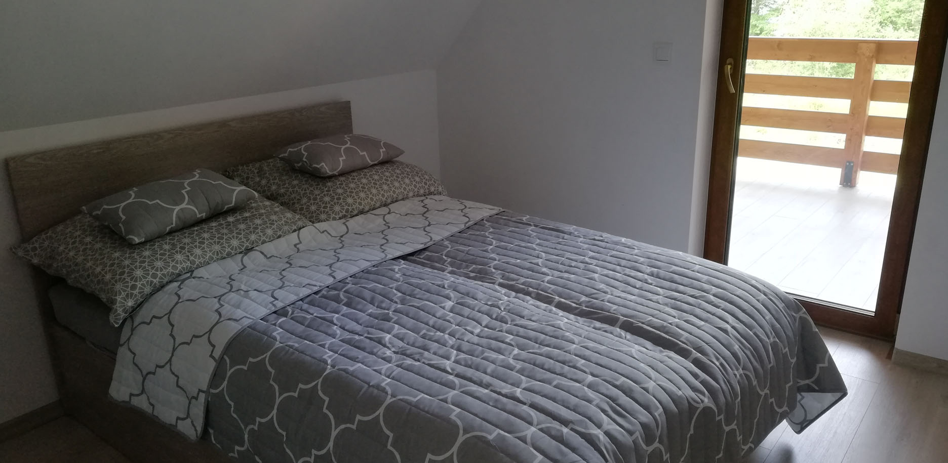 - pokój sypialny III: podwójne łóżko, szafa, stolik i balkon z widokiem na jezioro Tajty