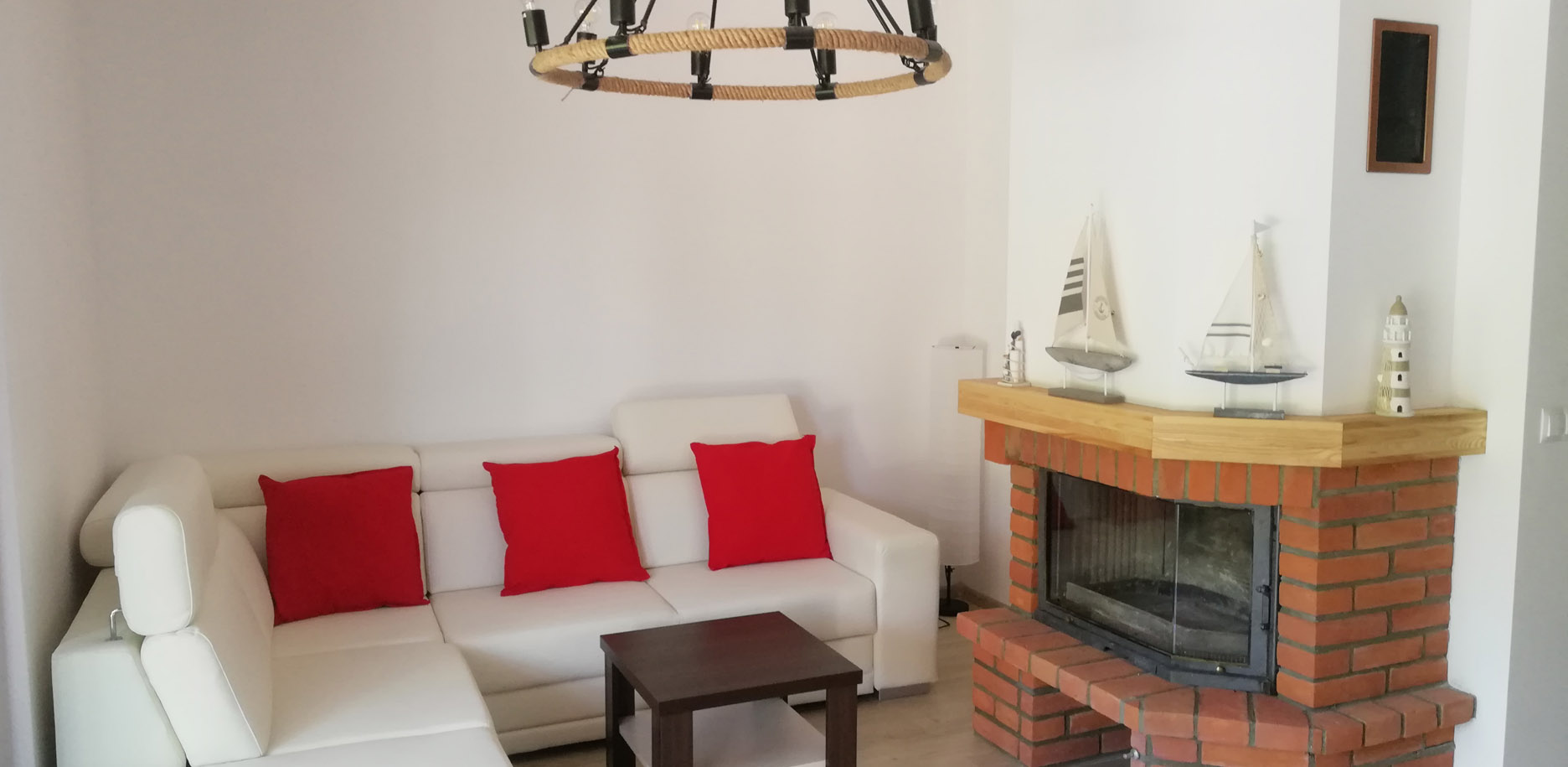 - wygodny salon wypoczynkowy z rozkładaną podwójną kanapą, z kominkiem i dużym tv (z podłączeniem do internetu),