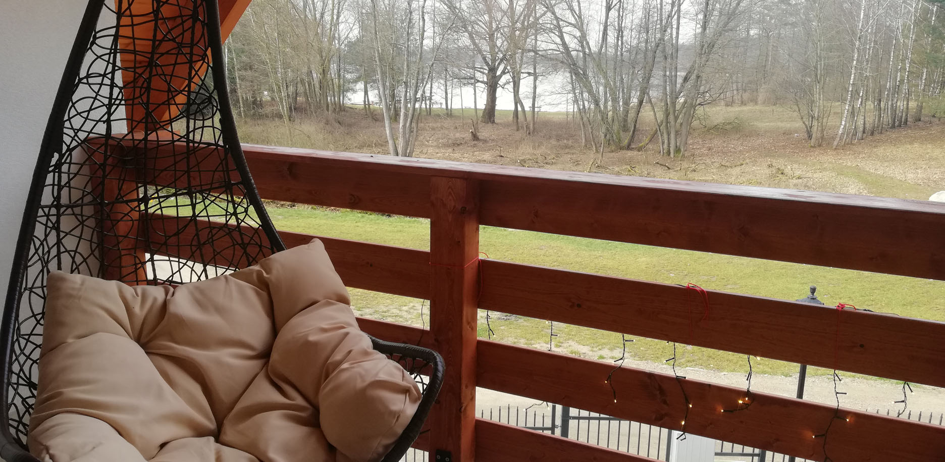 - pokój sypialny II: podwójne łóżko, szafa, stolik i balkon z widokiem na jezioro Tajty